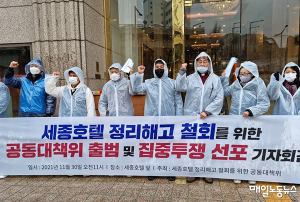 세종호텔 정리해고 철회를 위한 공동대책위원회는 30일 오전 서울 중구 세종호텔 앞에서 기자회견을 열고 “정리해고 대상이 된 15명 모두 관광레저산업노조 세종호텔지부 조합원으로 노조파괴를 위한 표적해고이자 지부와 제대로 된 협의도 하지 않은 일방적 해고”라며 “정리해고를 철회하고 고용안정지원금 신청과 식음사업장 영업정상화 등을 통한 위기 극복에 나서야 한다”고 밝혔다.