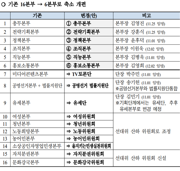 기존 16개 본부 중 위원회로 편제된 곳은 노동희망본부 이외에도 여성·청년·농어민·소상공인자영업민생·자치분권·문화강국본부다. 소상공인자영업민생본부는 을지키는민생실천위원회로 이름을 조정했다.<표 참조>