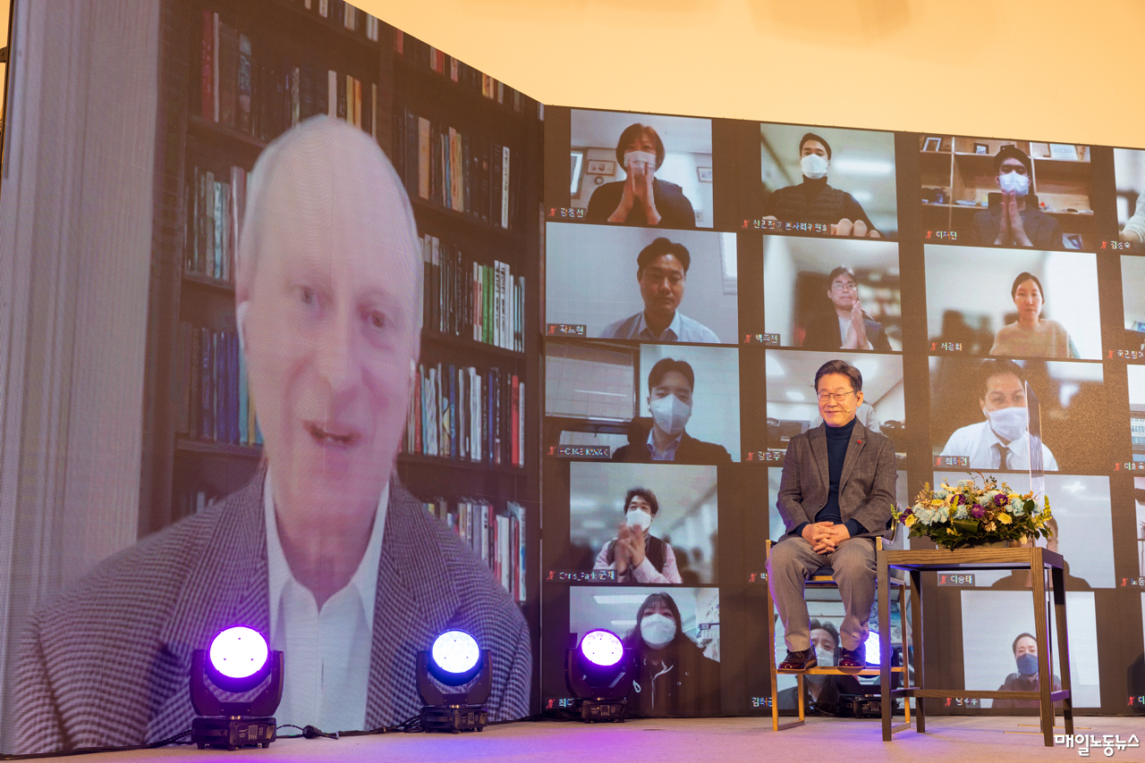 이재명 더불어민주당 대선후보는 21일 오전 서울 중구 정동1928아트센터에서 샌델 교수는 ‘공정과 정의’를 주제로 화상 대담했다.