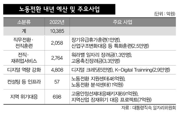 정부가 산업전환·기후위기에 따른 공정한 노동전환을 위한 예산을 1조385억원 편성했다. 내년에 국회에서 ‘산업구조 전환에 따른 노동전환 지원에 관한 법률’이 제정되면 하반기에는 ‘1차 노동전환 기본계획’을 수립하겠다는 구상이다.