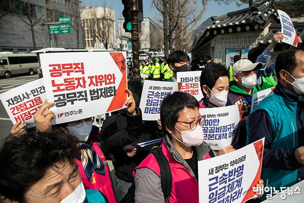 민주노총 소속 공공부문 비정규 노동자들이 윤석열 대통령 당선자에게 불평등 해소 대책을 요구하며 투쟁을 선포했다.