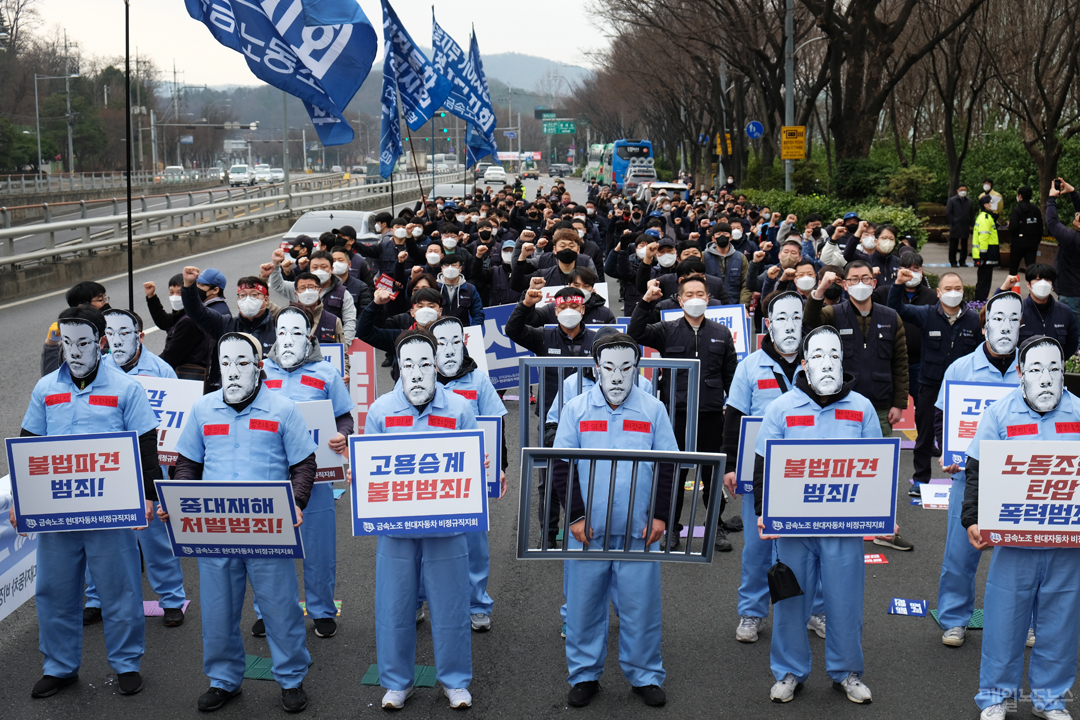 노조는 “비정규 노동자들에게는 서슬퍼런 법의 잣대가 재벌 앞에서는 무용지물이 된다”며 “2004년 노동부에 의해 불법파견이라고 판정된 지 18년이 된 현대차그룹은 하급심에서 34번의 판결, 대법원에서 3번의 판결이 날 때까지 벌금 한번 물은 적이 없다”고 비판했다. 비정규 노동자들은 “대법원의 판결 지연은 불법파견 범죄자들에게 반성과 시정이 아닌 오히려 피해 당사자를 탄압하고, 해고할 기회와 시간을 제공했다”고 목소리 높였다.