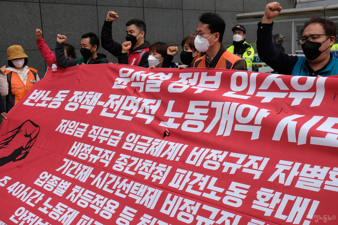 민주일반연맹은 30일 오전 서울 종로구 대통령직 인수위원회 앞에서 기자회견을 열고 이같이 밝혔다. 윤석열 당선자는 선택적 근로시간제 정산기간 확대·최저임금 업종별 차등적용 등 노동시간을 유연화하는 정책을 예고한 바 있다. 임금체계도 직무·성과급체계로 개편한다는 계획이다.