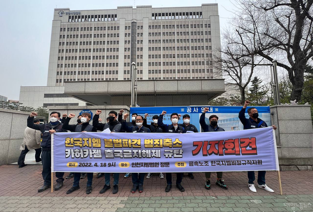 한국지엠비정규직지회는 이날 오전 인천 미추홀구 인천지법 앞에서 기자회견을 열고 “불법파견 범죄자 카허 카젬 사장 출국금지 해제를 중단하라”고 주장했다. 지난달 3일 법무부와 검찰은 불법파견 혐의로 재판을 받는 카허 카젬 사장에 출국금지 조치를 취했지만, 같은달 25일 출국금지 해제를 결정했다.