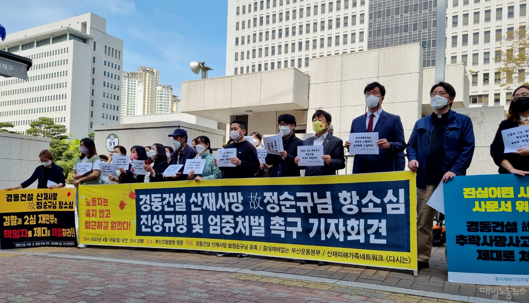 유족과 ‘중대재해 없는 부산운동본부’, 산재피해가족네트워크 ‘다시는’ 등은 이날 오전 재판을 앞두고 엄중 처벌을 촉구했다. 정석채씨는 “목격자와 CCTV가 없는 현장에서 피해자가 불안전한 행동을 보였다며 경동건설이 사고의 책임을 고인에게 떠넘기고 있다”며 “경동건설과 하청업체는 고인에 대한 명예훼손과 은폐·조작을 일삼았다”고 비판했다.