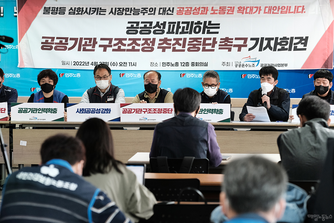 공공운수노조는 27일 오전 서울 중구 민주노총 중회의실에서 기자회견을 열고 “공공성을 파괴하는 공공기관 구조조정 추진을 중단하라”고 촉구했다. 노조는 “대선이 끝난 후 인수위는 지속적으로 △민간 위주 △규제 완화 △노동 유연화 등의 시장만능주의 정책방향을 강조하고 있다”며 “코로나19 이후 공공성 강화가 더욱 필요한 이 시기에 윤석열 당선자는 규제완화와 시장주의 강화만을 이야기하고 있다”고 비판했다.