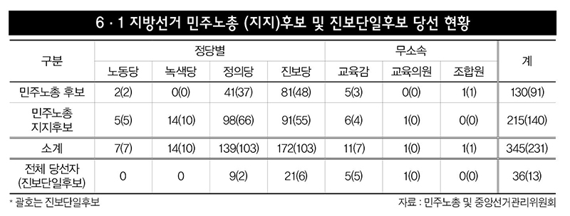 민주노총 후보와 지지후보까지 범위를 넓히면 전체 345명 중 교육감 후보(11명)을 뺀 334명 중 진보정당 당선자는 30명(9.0%)에 그쳤다. 민주노총 후보로 출마해 당선한 이는 6명(정의당 1명·진보당 5명), 민주노총 지지후보는 24명(정의당 8명, 진보당 16명)이다.<표 참조>