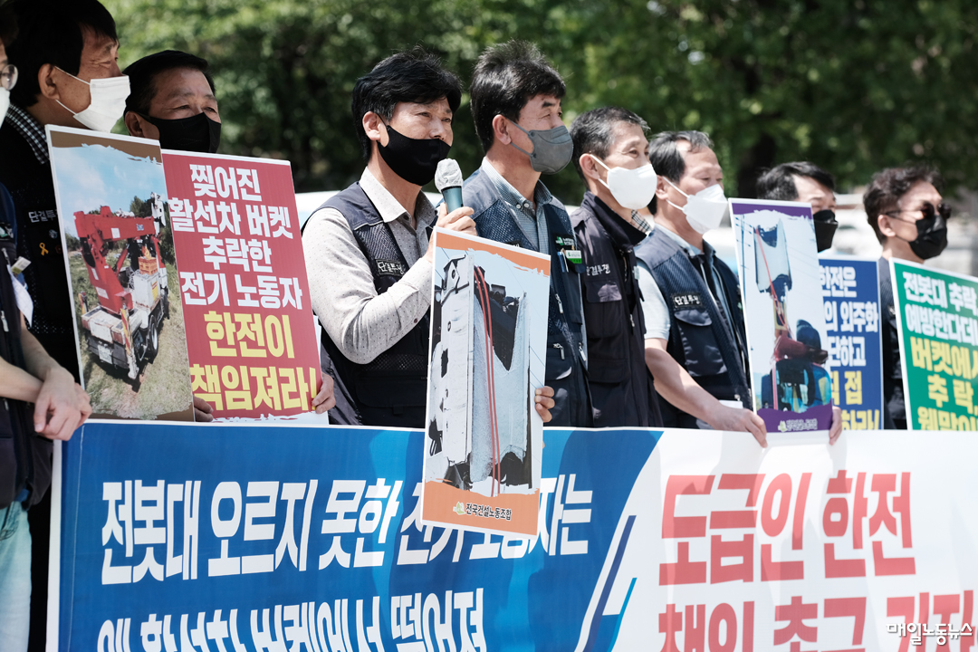 노조에 따르면 지난 4월22일 전남 곡성에서 40대 전기노동자 A씨가 활선차량 버킷에서 떨어져 하반신이 마비됐다. A씨는 갈비뼈 골절과 양쪽 어깨 탈골, 장기 내 출혈로 입원 치료를 받고 있다.