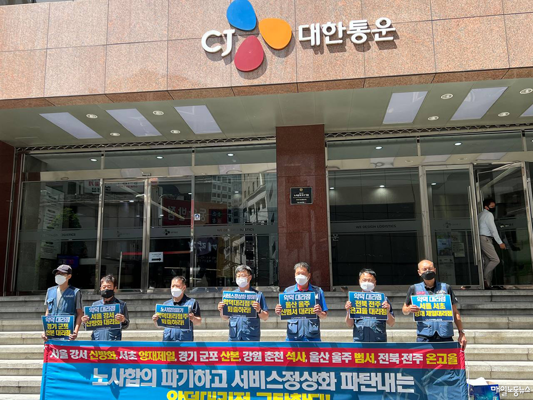 택배노조 CJ대한통운본부는 7일 오전 서울 중구 CJ대한통운 본사 앞에서 기자회견을 열고 “CJ대한통운 원청은 노사합의를 파기하고 서비스 정상화를 파탄 내는 대리점들에 대해 특단의 대책을 마련하라”며 이같이 밝혔다.