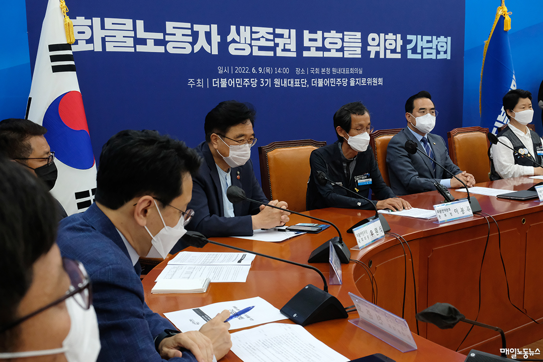 이날 민주당 원내대표실에서 열린 ‘화물연대본부 총파업 돌입 관련 민생간담회’는 애초 박홍근 원내대표가 화물연대본부와 국토교통부 간 입장 조율을 위해 마련됐다. 그런데 국토부가 파업 대응에 바쁘다는 이유로 간담회에 불참했다.