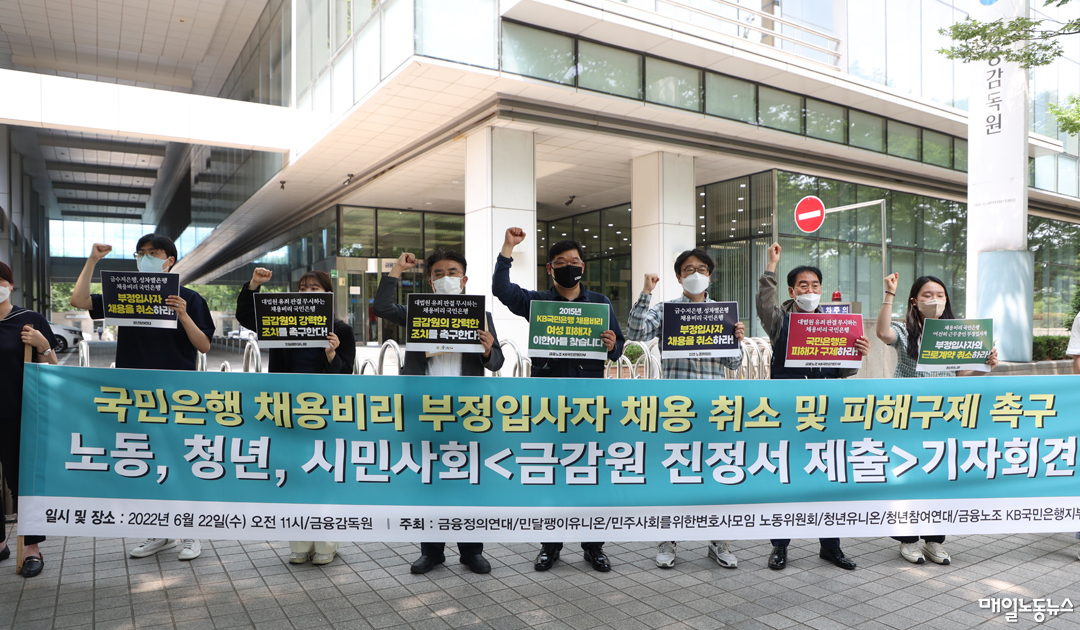 금융노조 KB국민은행지부와 금융정의연대·민달팽이유니온·민변 노동위원회·청년유니온·청년참여연대는 22일 오전 서울 여의도 금감원 앞에서 기자회견을 열고 “국민은행 부정입사자는 현재까지 고액 연봉을 받으면서 재직 중인 반면 피해 청년들은 부당하게 기회를 박탈당했음에도 외면당하고 있다”며 “채용비리에 대한 책임의식 없이 대법원 판결마저 무시하고 있는 국민은행에 대한 강력한 조치가 시급한 상황”이라고 지적했다.