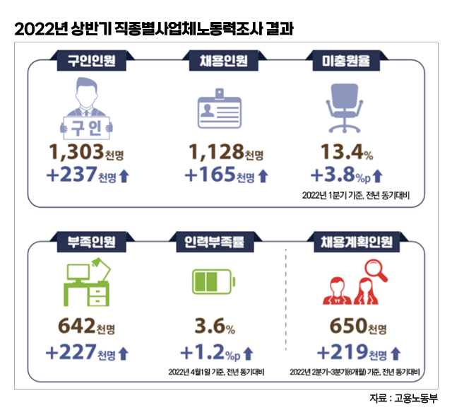 이런 인력난은 하반기에도 심각할 것으로 예상된다. 지난 4월1일 기준 기업의 부족인원은 64만2천명으로 지난해 상반기보다 54.6%(22만7천명) 급증했다. 부족 인원은 정상적인 경영을 위해 추가로 필요한 인원을 뜻한다.
