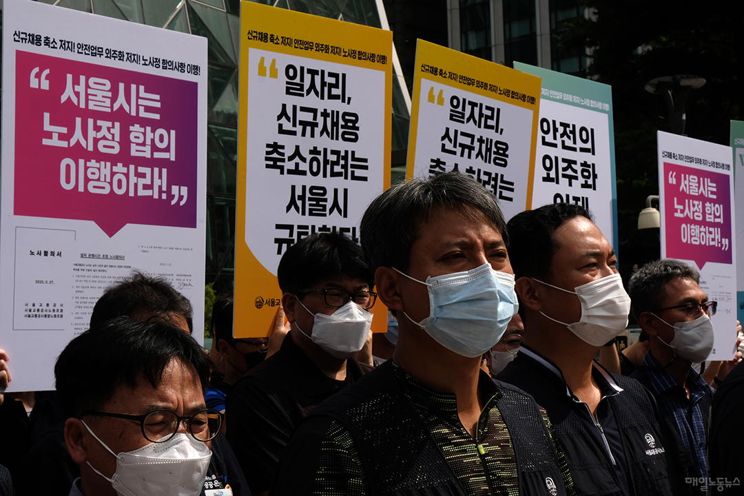 노조는 서울시가 오세훈 시장의 공공부문 경영혁신 기조에 따라 올해 공사 신규채용 규모를 줄이려 한다고 주장한다. 노조가 공사를 통해 파악한 바에 따르면 올해 채용 규모는 지난해 449명보다 적은 수준이라고 한다. 반면 노조는 △지난 5월27일 서울시가 참여한 노사정 합의 △서울시 청년일자리 기본조례에 따른 청년고용 의무 △퇴직으로 인한 결원 충원을 근거로 최소 732명을 충원해야 한다는 입장이다.