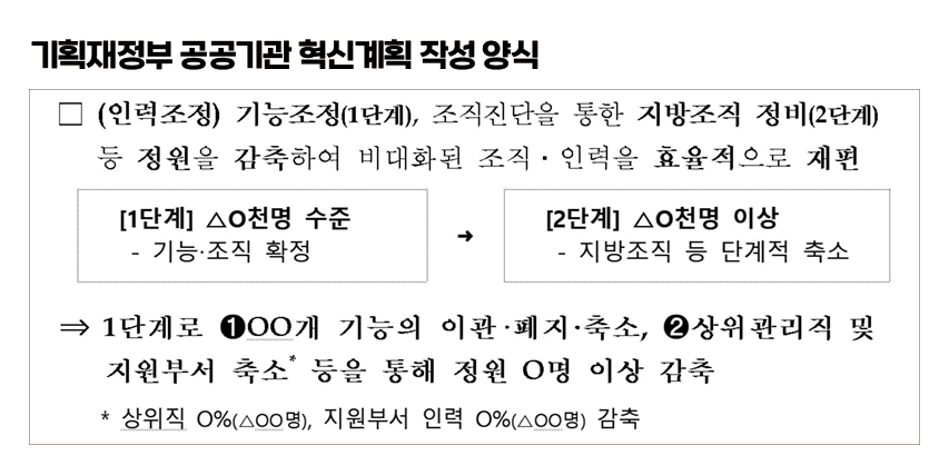 결국 무리한 구조조정 시도라는 비판이 힘을 얻는다. 기재부는 앞서 공공기관 파티는 끝났다며 엄포를 놓은 뒤 7월29일 공공기관 구조조정 내용을 담은 혁신가이드라인을 발표했고 8월 말까지 계획안 제출을 강제했다.