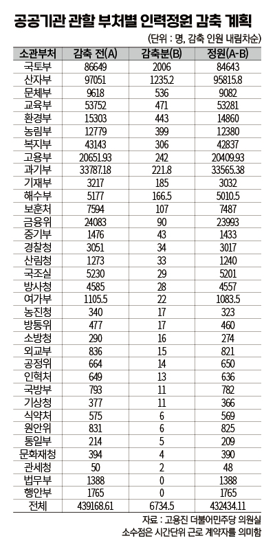 정부부처별로 보면, 국토교통부가 가장 많은 2천6명을 감축한다. 산업자원통상부(1천236명), 문화체육관광부(536명), 교육부(471명), 환경부(443명), 농림축산식품부(399명), 보건복지부(306명), 고용노동부(242명) 등의 순이다. 행정안전부와 법무부 산하 공공기관은 인력감축 계획이 없는 것으로 나타났다.<표 참조>