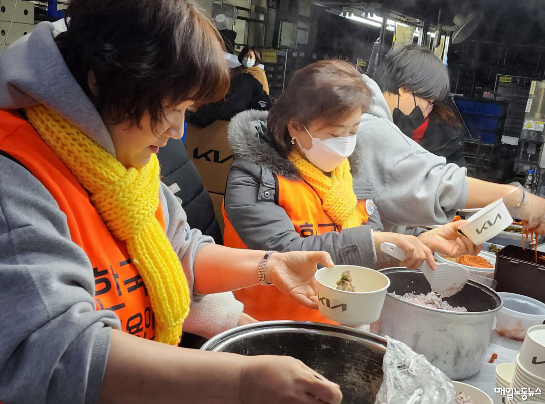 한국와이퍼가 밝힌 청산 개시일을 사흘 앞둔 지난 6일 정오 경기도 안산시에 위치한 한국와이퍼 공장은 점심시간이 한창이었다. 황은숙 금속노조 한국와이퍼분회 부분회장이 소고기뭇국을 그릇에 담아 배식하고, 밥과 국을 두 손에 든 조합원들은 박스와 포장지를 겹겹이 쌓아 만든 식탁을 중심으로 옹기종기 모여 앉았다. 제품을 나르는 데 사용하던 접이식 카트는 의자로 변신했다. 김·김치·파김치·고추장아찌·진미채 볶음 등이 식탁 위에 어지러이 놓였다. 관심은 ‘정남 언니네’ 김치에 쏠렸다.