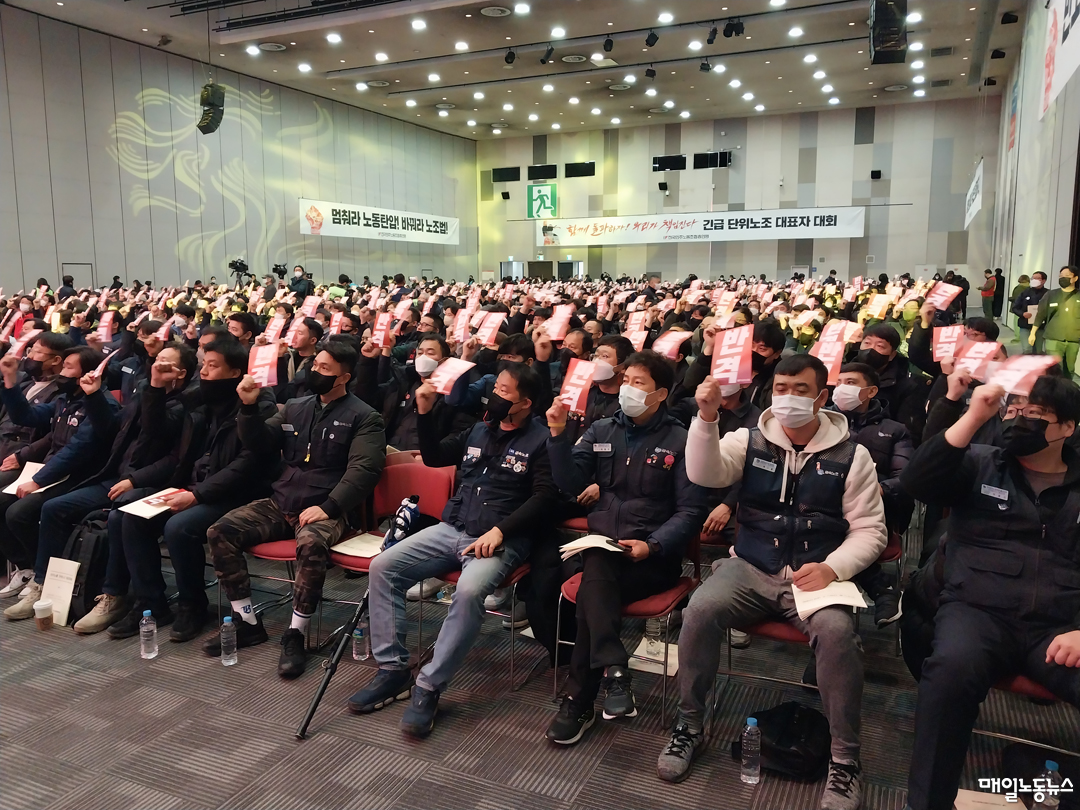 민주노총은 17일 오후 고양시 일산서구 킨텍스에서 민주노총 단위노조 대표자대회를 열고 이같이 결의했다. 이날 대표자대회는 다음달 7일 정기대의원대회에 앞서 산별노조와 지부 대표자에게 윤석열 정부 행태 관련 배경을 분석하고 민주노총 지침에 대해 의견을 구하기 위해 열렸다. 산별노조과 지부 대표자·간부 등 1천400여명이 모였다.