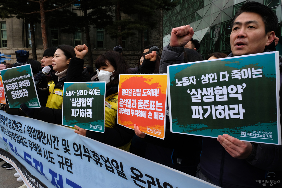마트산업노조와 노조 서울본부는 17일 오전 서울시청 앞에서 기자회견을 열고 “의무휴업은 노동자의 근로조건에 큰 영향을 미치는 사안인데도 대구시를 포함해 많은 지자체가 이를 결정하는 데에 직접적 이해당사자인 마트노동자들의 의견을 제대로 청취하지 않고 있다”고 지적했다. 마트노조는 지난 16일부터 이날까지 서울시청을 비롯해 전국 8개 시·도 청사 앞에서 전국 동시다발 기자회견을 열었다.