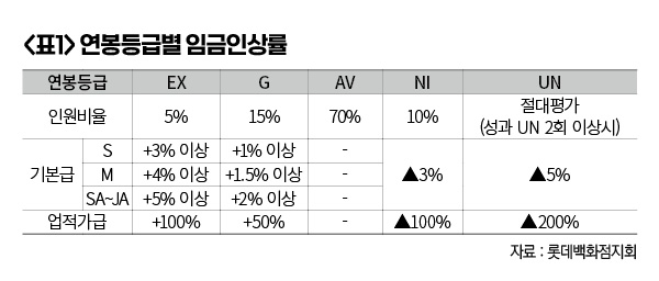 롯데백화점은 인사평가 결과에 따라 연봉등급을 EX(Excellent), G(Good), AV(Average), NI(Need Improvement), UN(Unsatisfactory) 5개 등급으로 구분한다. 등급에 따라 업적가급(성과에 따라 차등 지급되는 가변적인 임금)을 달리 적용받던 것에서 2021년부터 기본급까지 삭감하는 방향으로 개편했다. 최고 등급을 받으면 직급에 따라 기본급이 3~5% 인상되고, 최하 등급을 받으면 기본급이 5% 삭감되는 식이다. 업적가급 또한 100% 추가 지급부터 200% 삭감까지 될 수 있다.<표1 참조>