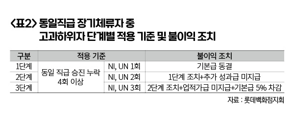 이와 함께 저성과자 관리제도의 일환으로 승진누락이 4회 이상 되는 직원(동일직급 장기체류자)이 연봉등급 최하등급인 NI·UN을 받을 경우 그 횟수에 따라 단계적으로 임금상 불이익을 주는 제도를 실시하고 있다. 롯데백화점은 2018년 3월 동일직급 장기체류자 제도를 변경했다. 이전에는 ‘승진누락 4회 이상’ 직원이 하위 등급(NI·UN)을 1~2회 받으면 기본급을 동결하고, 3회 받으면 추가성과급을 지급하지 않았다. 이를 하위고과 1회 기본급 동결, 2회 기본급 동결+추가성과급 미지급, 3회 기본급 동결+추가 성과급 미지급+업적가급 미지급+기본급 5% 차감으로 바꾼 것이다.<표2 참조> NI나 UN 등급을 적용받으면 한 단계식 불이익의 정도가 심화되는 구조다. AV 등급을 받아도 기존 단계가 유지되고 상위 등급인 EX나 G를 받아야만 1단계씩 이전 단계로 회복될 수 있다.