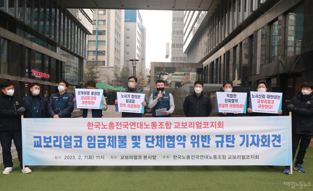 한국노총전국연대노조 교보리얼코지회(지회장 최창녕)는 7일 오전 서울 중구 교보리얼코 본사 앞에서 기자회견을 열고 “회사는 임금협약 불이행에 따라 발생하는 임금체불 문제를 해결하라”고 촉구했다.