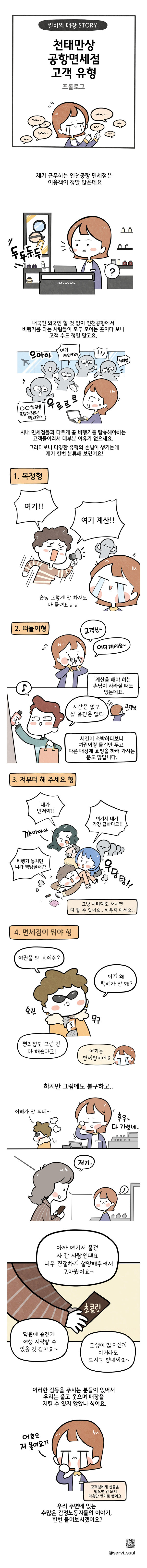 하루에도 수십·수백명의 고객과 만나는 감정노동자, 이것이 우리의 이름이다. 백화점면세점판매서비스노조가 다양한 현장에서 일하는 ‘감정노동자’들의 모습을 알리고, 공감할 수 있게 만화를 제작했다. <썰비의 매장 STORY>다. 이 이야기는 노동자들에게서 모집한 실제 사례를 바탕으로 제작됐다. 주인공 ‘썰비’는 나와는 동떨어진 먼 누군가가 아니라 내 가족이나 친구, 이웃일지도 모른다. 감정노동자 이야기가 ‘썰’로만 남지 않기를, 이 만화가 남모르는 곳에서 흘리는 ‘썰비’들의 눈물을 닦아 주기를 기대한다.