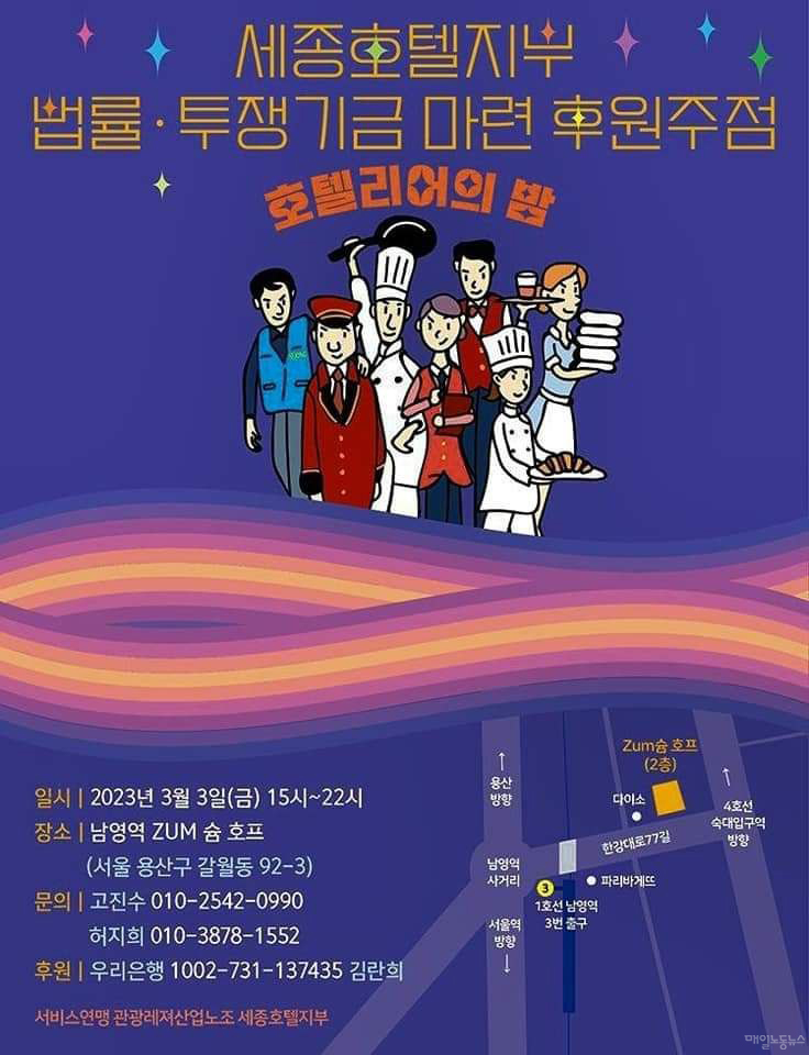 22일 관광레저산업노조 세종호텔지부(지부장 고진수)에 따르면 최근 서울중앙지법은 지부 조합원들에게 소송비용액확정 결정문을 우편으로 송달했다. 지부가 2021년 12월 사측을 상대로 제기한 직장폐쇄 해제 가처분 소송에서 지부가 패소하면서 소송비용을 떠안게 된 것이다. 이와 함께 서울중앙지법은 지난 8일 고진수 지부장에게 집시법 위반 혐의로 벌금 50만원의 약식명령을 내렸다.