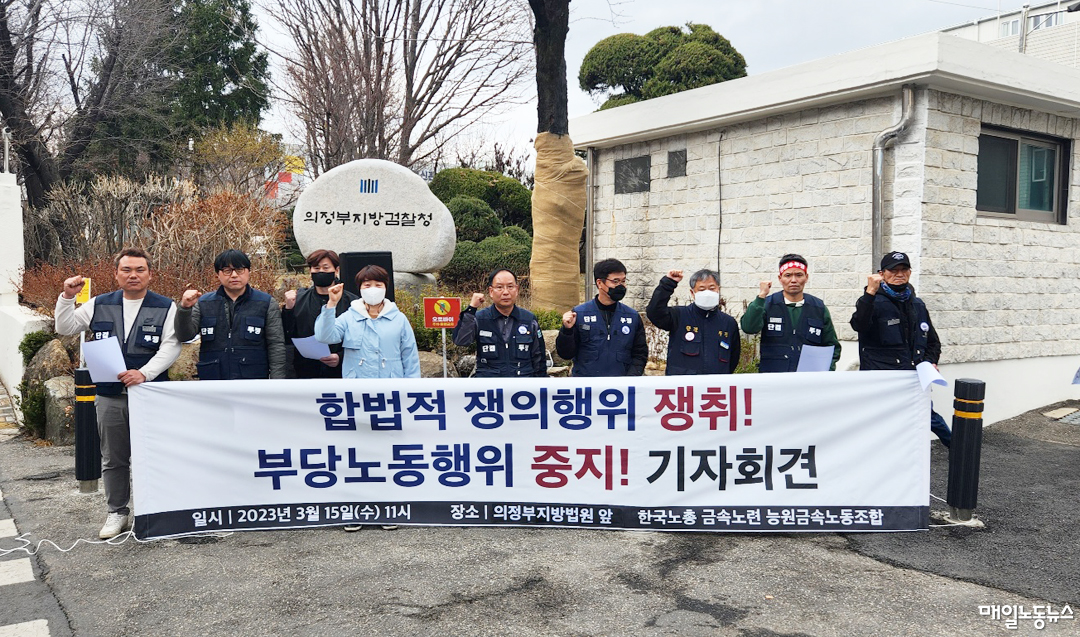 노조는 15일 오전 의정부지방법원 앞에서 기자회견을 열고 이렇게 주장했다. 사건은 지난해 12월로 거슬러 올라간다. 능원금속공업 노사는 2022년 단체협상 중 이견을 좁히지 못해 경기지방노동위원회를 찾았다. 노조는 만 60세 정년이 지난 뒤 1년 단위로 촉탁직으로 일할 수 있는 단협 조항을 3~5년으로 늘려 고용불안을 해소하자고 주장했지만 사측은 거부했다. 경기지노위는 그해 12월15일 조정중지를 결정했다. 나흘 뒤 노조는 ‘2022년 단체협상 승리를 위한 쟁의행위 찬반투표’를 거쳐 같은달 30일 종무식에 불참하는 방식으로 파업했다. 올해 1월9일에도 4시간 부분파업을 했다.
