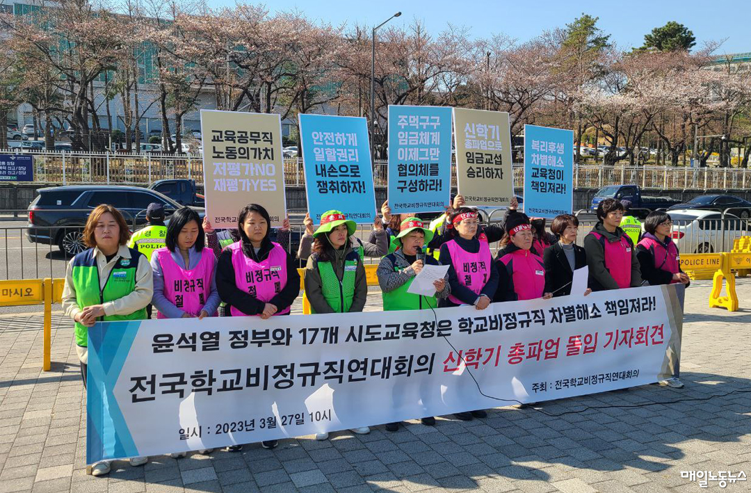 공공운수노조 교육공무직본부·전국여성노조·학교비정규직노조로 구성된 학교비정규직연대회의는 27일 오전 서울 용산구 대통령실 앞에서 기자회견을 열고 “7개월의 장기간 교섭에도 2022년 집단 임금교섭은 타결이 아닌 총파업으로 가고 있다”며 “우리는 어떠한 비정규직 차별도 거부할 것이다. 이에 제대로 응답하지 않는다면 31일 파업 투쟁을 가열차게 진행할 것”이라고 밝혔다.