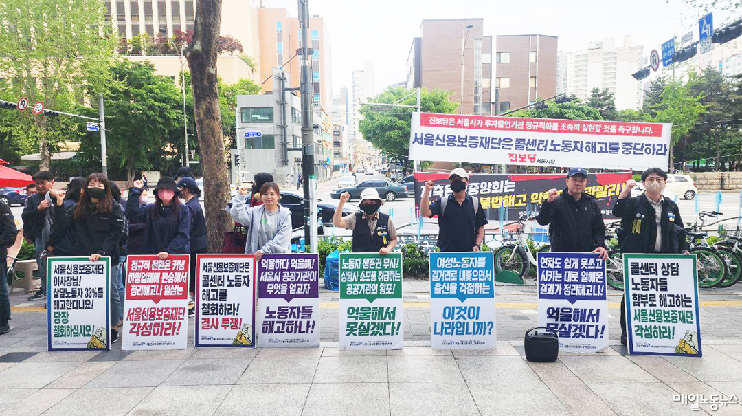 공공운수노조 희망연대본부 서울신용보증재단고객센터지부는 24일 오후 서울 마포구 서울신용보증재단 앞에서 결의대회를 열고 이같이 밝혔다.