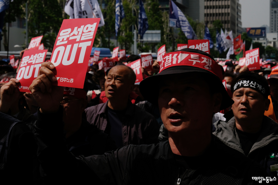 민주노총은 10일 오후 서울 용산구 대통령실 앞에서 단위노조 대표자 결의대회를 열고 “윤석열 정권 1년간 민주주의는 파괴되고 서민의 삶은 벼랑 끝으로 내몰렸으며 나라의 자주성은 실종됐다”며 “노동개혁 거짓 명분을 내세워 노동개악·노조말살 정책을 지속하고 있다”고 규탄했다. 이어 민주노총은 “노동자와 민중에게 냉혹한 윤석열 대통령은 식민지배 반성과 사죄 없는 일본에는 한없이 너그럽고, 부자에게는 감세를 선물하고 서민에게 공공요금 폭탄을 안기고 있다”며 “노동자와 국민을 적대시한 정권의 운명은 이승만·박정희·박근혜 정권과 다르지 않을 것”이라고 강조했다.