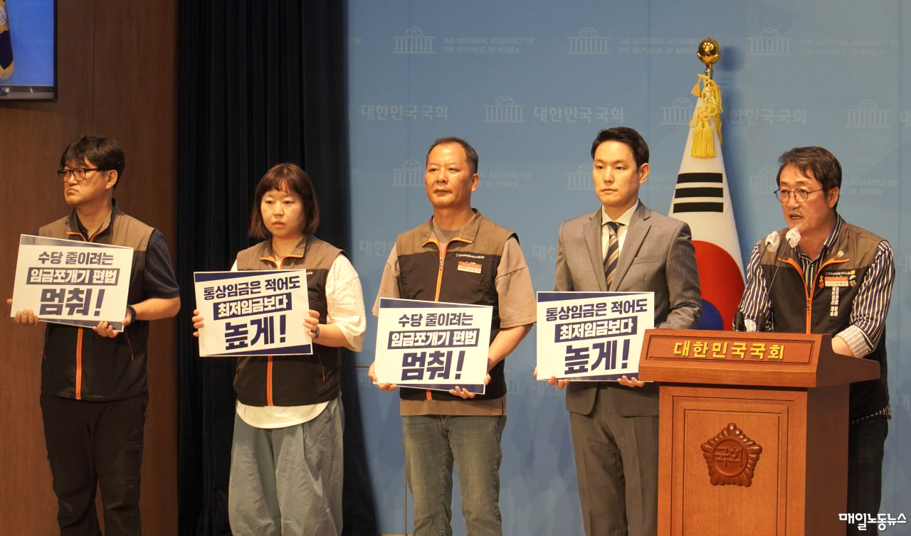 김한규 의원이 이날 오전 국회 소통관에서 연 기자회견에서 김씨는 “낮은 출산율을 극복하겠다며 출산 지원금을 신설하면서, 정작 일하는 엄마들이 최저임금보다 낮은 통상임금 때문에 터무니없는 육아휴직급여를 받는 현실은 외면한다”고 지적했다. 이어 “법으로 최저임금을 정한 이유가 있다”며 “법의 허점을 이용해 통상임금을 최저임금보다 낮게 책정했다면 법으로 보완해야 한다”고 강조했다.