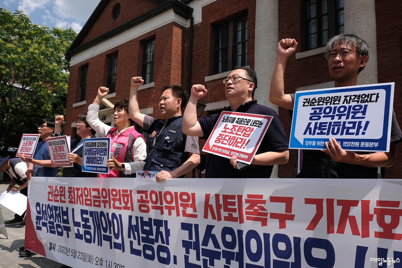 모두를 위한 최저임금 1만2천원 운동본부는 23일 오후 서울 중구 정동1928아트센터 앞에서 기자회견을 열고 “지난 2년간 최저임금 취지를 망각하고 최저임금 인상을 억제한 권 간사 사퇴를 요구했으나 여전히 자리를 지키면서 재벌 대기업의 이익을 지키는 데 최선을 다하고 있다”며 “주 69시간 과로사 조장안을 만든 주범이자 노동개악 선봉에 선 권 간사는 저임금 노동자를 보호하는 최저임금을 결정할 자리에 있을 자격이 없다”고 강조했다. 정동아트센터에서는 이날 권 간사가 참여하고 있는 상생임금위원회 토론회가 개최됐다.