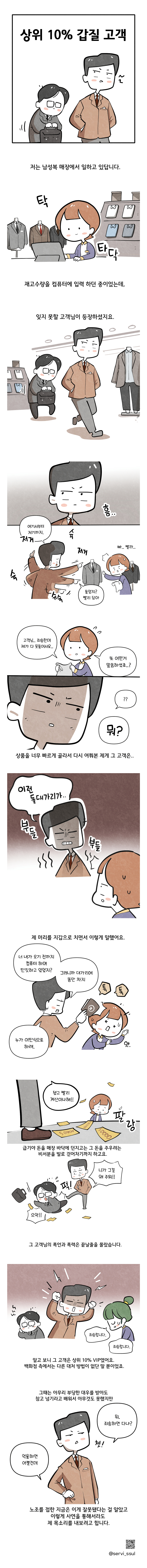 하루에도 수십·수백명의 고객과 만나는 감정노동자, 이것이 우리의 이름이다. 백화점면세점판매서비스노조가 다양한 현장에서 일하는 ‘감정노동자’들의 모습을 알리고, 공감할 수 있게 만화를 제작했다. <썰비의 매장 STORY>다. 이 이야기는 노동자들에게서 모집한 실제 사례를 바탕으로 제작됐다. 주인공 ‘썰비’는 나와는 동떨어진 먼 누군가가 아니라 내 가족이나 친구, 이웃일지도 모른다. 감정노동자 이야기가 ‘썰’로만 남지 않기를, 이 만화가 남모르는 곳에서 흘리는 ‘썰비’들의 눈물을 닦아 주기를 기대한다.