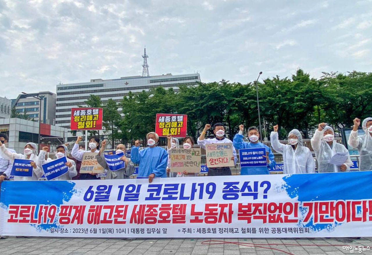 세종호텔 정리해고 철회를 위한 공동대책위원회는 1일 오전 용산 대통령실 앞에서 기자회견을 열고 “세종호텔은 해고노동자 복직을 통해 식음료 사업을 재개하고 호텔 정상화에 나서야 한다”며 “정부는 코로나19 종식 선언만 하지 말고 해고된 노동자들이 복직할 수 있게 해야 한다”고 촉구했다.