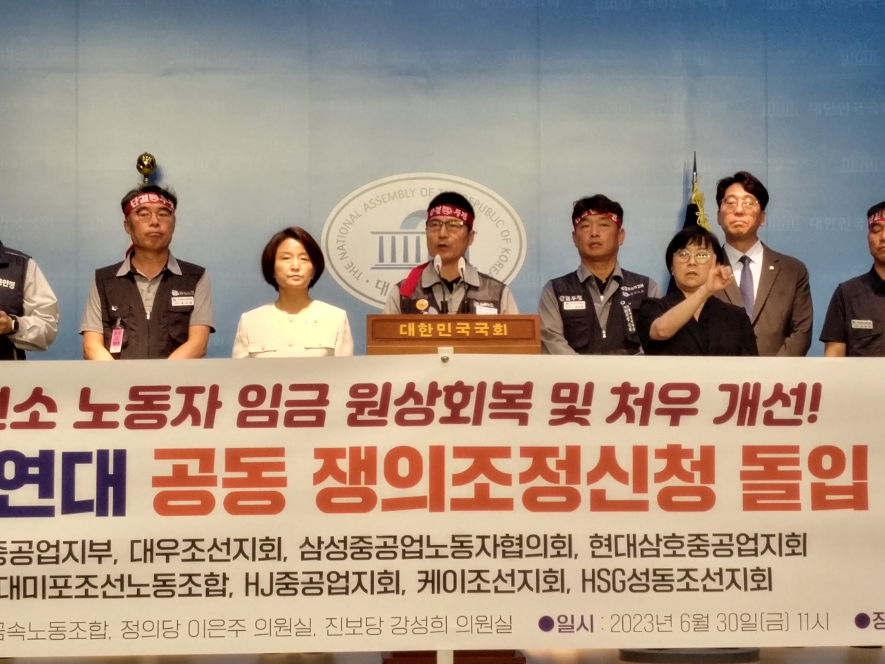 금속노조와 조선업종노조연대는 30일 오전 국회 소통관에서 기자회견을 열고 이날 8개 사업장 노조 모두 노동위원회에 쟁의조정 신청을 한다고 밝혔다. 조선노연은 금속노조 소속 6곳(현대중공업지부·대우조선지회·HSG성동조선지회·케이조선지회·현대삼호중공업지회·HJ중공업지회)과 상급단체가 없는 삼성중공업노동자협의회·현대미포조선노조 등 8개 조선소 노조가 조선산업정책과 현안에 공동대응하기 위해 만든 상설 연대기구다.