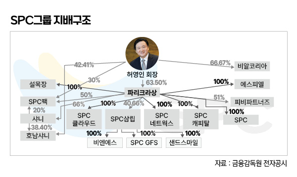 SPC그룹 지배구조를 보면 허 회장의 ‘지배력’은 뚜렷하다. 2021년 12월 기준 허 회장 일가가 지주회사 격인 파리크라상 지분 100%(허 회장 63.31%)를 보유하고 있다. 파리크라상은 SPL 지분 100%를 소유하고 있다. 총수 일가가 사실상 그룹 계열사의 지분을 독점해 ‘가족회사’ 형태로 운영되는 셈이다. 허 회장은 2017년 12월까지 파리크라상 등기이사를 역임했고, 2018년 3월까지 SPL 등기이사에 이름을 올렸다.