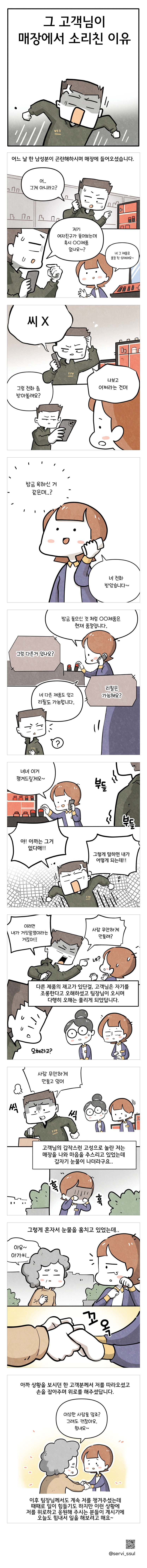 하루에도 수십·수백명의 고객과 만나는 감정노동자, 이것이 우리의 이름이다. 백화점면세점판매서비스노조가 다양한 현장에서 일하는 ‘감정노동자’들의 모습을 알리고, 공감할 수 있게 만화를 제작했다. <썰비의 매장 STORY>다. 이 이야기는 노동자들에게서 모집한 실제 사례를 바탕으로 제작됐다. 주인공 ‘썰비’는 나와는 동떨어진 먼 누군가가 아니라 내 가족이나 친구, 이웃일지도 모른다. 감정노동자 이야기가 ‘썰’로만 남지 않기를, 이 만화가 남모르는 곳에서 흘리는 ‘썰비’들의 눈물을 닦아 주기를 기대한다.