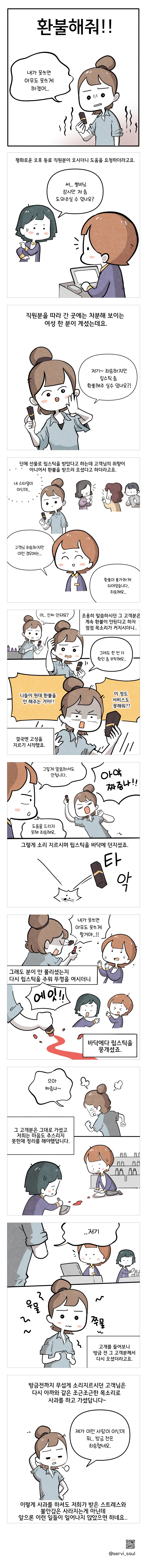 하루에도 수십·수백명의 고객과 만나는 감정노동자, 이것이 우리의 이름이다. 백화점면세점판매서비스노조가 다양한 현장에서 일하는 ‘감정노동자’들의 모습을 알리고, 공감할 수 있게 만화를 제작했다. <썰비의 매장 STORY>다. 이 이야기는 노동자들에게서 모집한 실제 사례를 바탕으로 제작됐다. 주인공 ‘썰비’는 나와는 동떨어진 먼 누군가가 아니라 내 가족이나 친구, 이웃일지도 모른다. 감정노동자 이야기가 ‘썰’로만 남지 않기를, 이 만화가 남모르는 곳에서 흘리는 ‘썰비’들의 눈물을 닦아 주기를 기대한다.