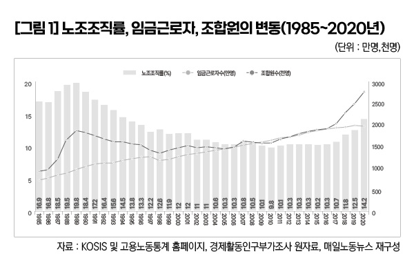 우리나라의 노조조직률은 1989년에 19.8%로 정점을 보인 후 추세적으로 계속 하락해 2010년에 9.8%로 절반가량 줄어들었다. 이후 10%대 초반을 기록하다가 2018년부터 다소 반등해 2020년까지 3년 사이 3.5%포인트 상승한 14.2%를 기록했다. 산업의 구조가 바뀌고 인구구조 및 노동력 구성이 변화하면서 대체로 선진 자본주의 국가에서도 노조조직률은 하락하는 모습을 보였다. 다만 구체적 노동시장 상황과 노조를 둘러싼 법·제도적 환경의 특성에 따라 하락 폭은 매우 다르다.