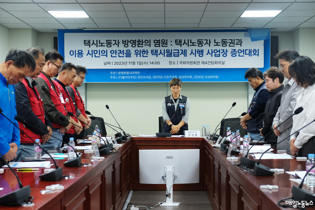 1일 오후 국회 의원회관에서 열린 ‘택시노동자 노동권과 이용 시민의 안전을 위한 택시월급제 시행 사업장 증언대회’에서는 여전히 택시사납금제가 근절되지 않았다는 증언이 나왔다. 증언대회는 ‘완전월급제 이행! 택시노동자 생존권 보장! 방영환열사 투쟁 승리를 위한 공동대책위원회’와 권인숙 더불어민주당 의원, 심상정·이은주 정의당 의원, 강성희 진보당 의원이 공동 주최했다.