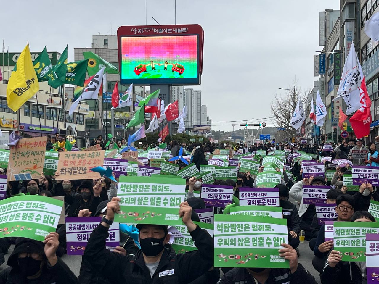 정의로운 전환을 촉구하는 노동자와 지역주민 1천명이 석탄화력발전소 폐지를 앞둔 충남 태안에서 행진했다.