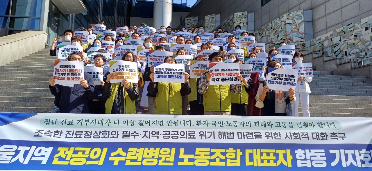병원에도 수수방관한다며 대책을 촉구했다. 이들은 “전공의 미복귀와 교수 집단 사표를 방관·묵인하거나 동조할 게 아니라 병원 정상화를 위해 보다 더 분명하고 책임 있는 강력한 조치를 해야 한다”며 “이런 노력 없이 의사 아닌 병원노동자에게 책임을 전가하는 것을 단호히 거부하겠다”고 밝혔다. 병원 가동률 저하를 이유로 일방적인 무급휴가를 강제할 게 아니라 노사가 함께 주 4일제 등 다양한 근무형태를 검토해 비상사태를 극복하자는 제안도 했다. 또 불가피하게 병동을 폐쇄할 땐 사용자 귀책사유에 따른 정당한 휴업수당 지급도 촉구했다. 이들은 수련병원을 소유한 대학 총장과 재단 이사장 등에 면담을 요구했다.