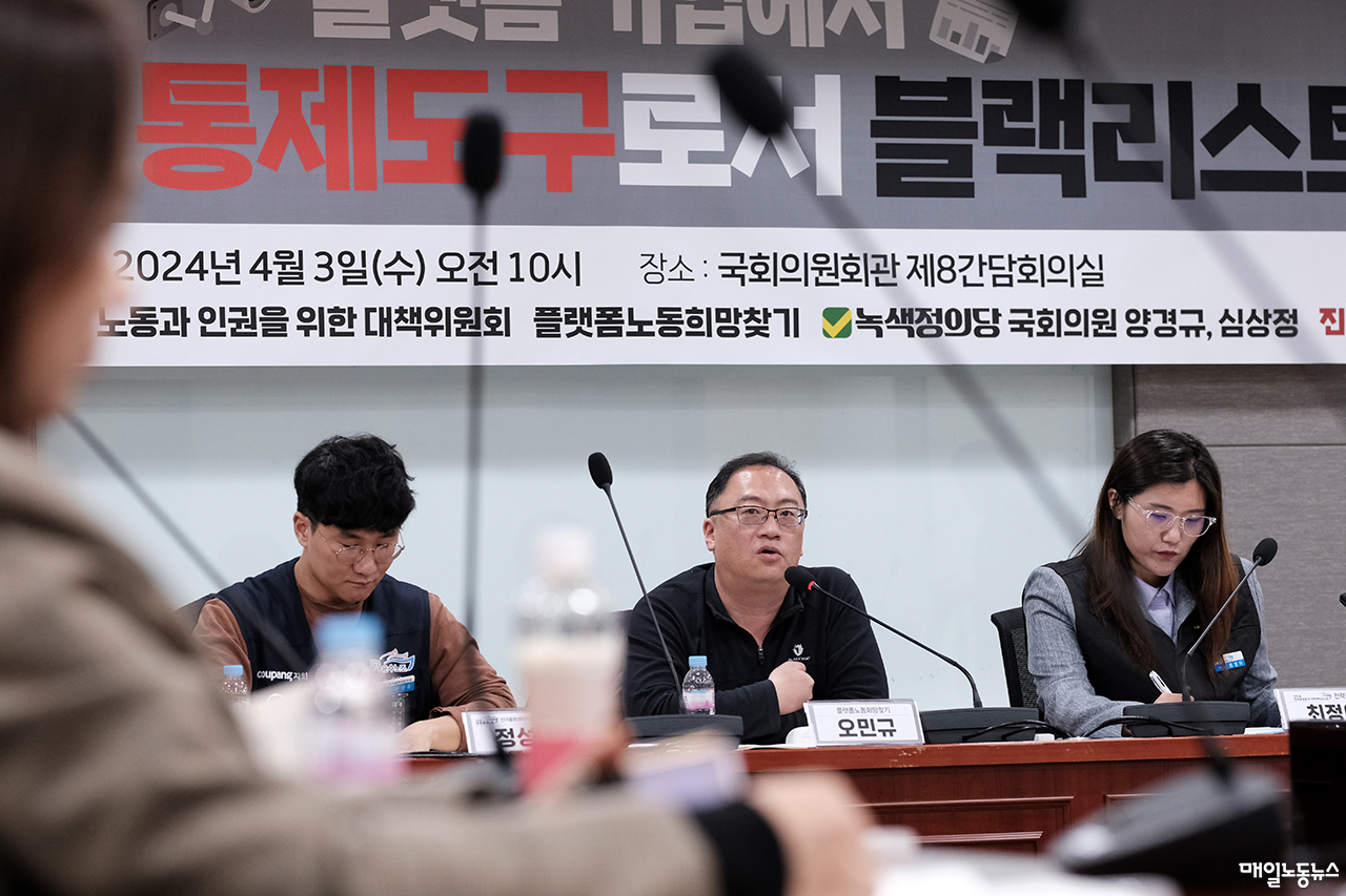 오민규 플랫폼노동희망찾기 집행책임자는 “고객과 언쟁하면 ‘락(접근금지)’을 걸어버리는 대리운전 플랫폼, 배정된 콜을 취소하면 계정을 정지하는 음식배달 플랫폼도 자체적인 블랙리스트를 운영해 왔다”고 설명했다.
