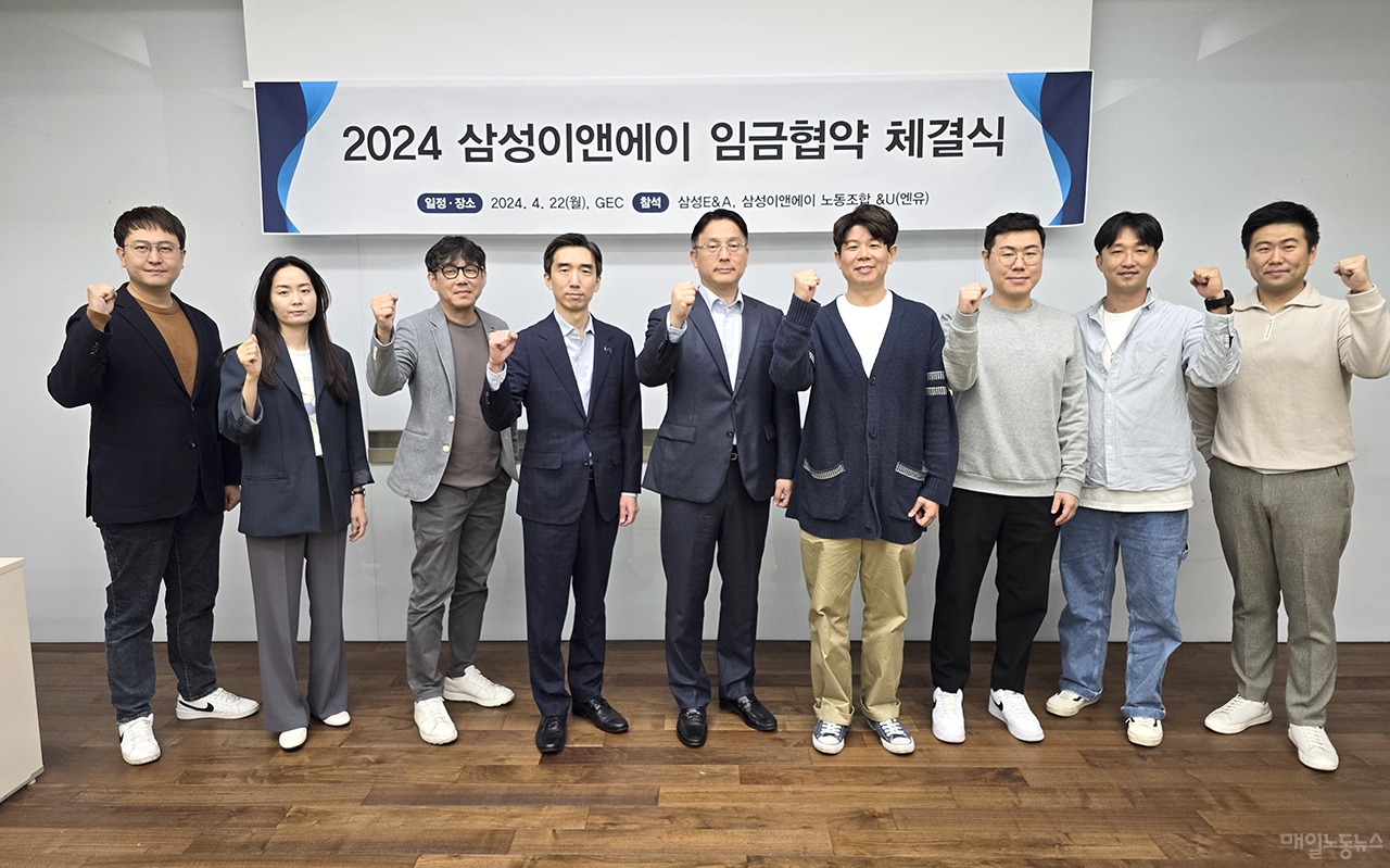 22일 삼성이엔에이노조(위원장 김봉준)에 따르면 이날 서울 강동구 GEC 사옥에서 ‘2024 임금협약 조인식’을 열었다. 노사는 기본인상률(베이스업) 3%, 평균 성과인상률 2%과 식대 인상(월 18만원→20만원)에 합의했다. 또한 ‘상박하후’인 간부급 페이존(임금 구간)을 조정해 상대적으로 높은 성과인상률을 적용받는 대상을 확대하고, 15년·25년 장기근속 근무한 직원을 대상으로 휴가(각각 3일·7일)와 휴가비(각각 100만원·200만원)를 제공했던 복지 혜택을 원상 복구하기로 했다. 2017년 폐지한 제도를 7년 만에 되살린 것이다.
