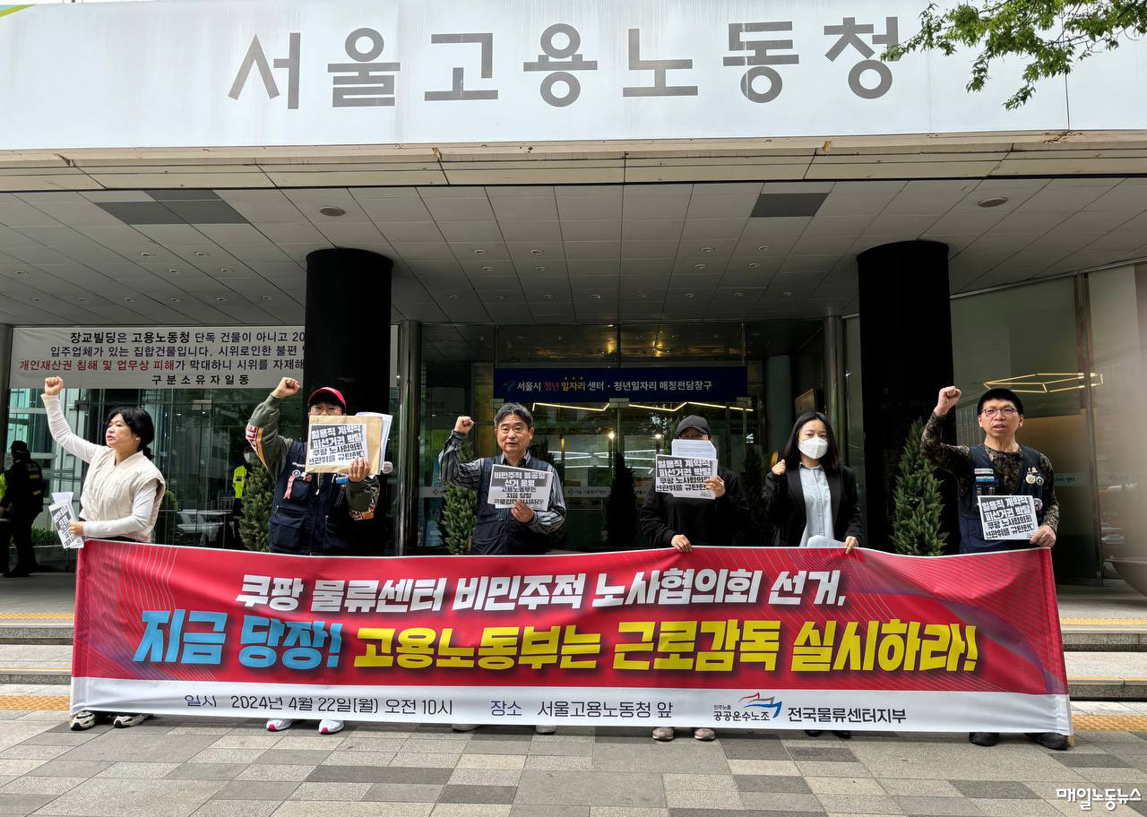 공공운수노조 전국물류센터지부는 22일 오전 서울 중구 서울지방고용노동청 앞에서 기자회견을 열고 “노동부는 피선거권이 박탈된 쿠팡물류센터 노사협의회 근로자대표 선거를 즉시 근로감독하라”고 밝혔다.