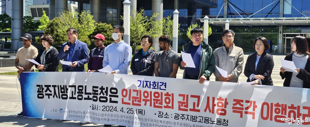 광주·전남이주노동자인권네트워크는 25일 오전 광주지방고용노동청 앞에서 기자회견을 열고 “광주노동청장은 인권위 권고사항을 즉각 이행하라”고 촉구했다. 스리랑카 출신인 A씨는 비전문취업 비자(E-9)를 발급받아 2019년 6월24일부터 광주의 한 업체에서 일했다. 코로나19 취업활동 연장 기간 1년이 포함돼 A씨의 취업활동기간 만료일은 지난해 6월24일이었다. 노사는 모두 연장근로에 동의해 구두로 합의했다.
