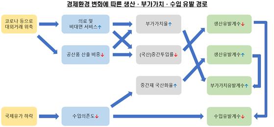 코로나19 영향으로 2020년 기준 대외거래 비중은 축소됐다. 공산품 수출 비중이 크게 감소해 국내총산출에서 수출이 차지하는 비중인 수출률은 18.7%에서 15.7%로 하락했다. 우리나라 수출품 비중은 공산품이 82.1%로 대부분을 차지한다. 2015년과 비교하면 2020년 공산품 비중은 조립가공제품 및 소비재제품을 중심으로 하락했다. 아울러 당시 국제 유가 하락 등으로 중간재 수입 비중이 감소하면서 수입 의존도도 12.5%에서 10.7%로 떨어졌다.