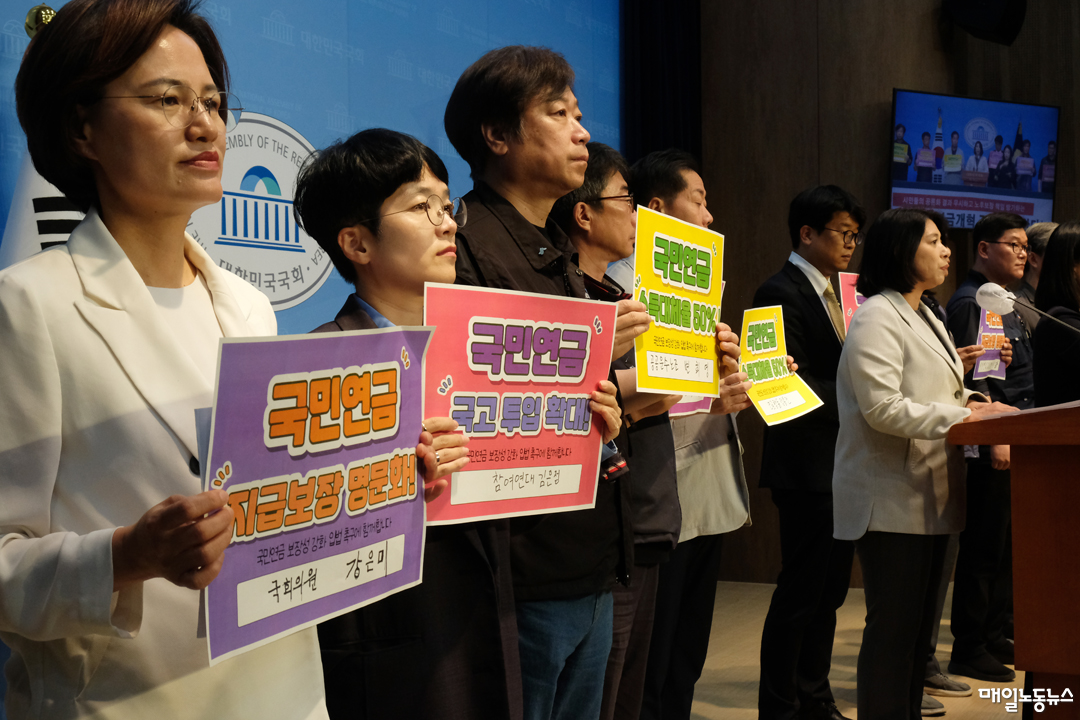 공적연금강화국민행동과 정의당은 8일 오후 국회 소통관에서 기자회견을 열고 국민의힘과 더불어민주당을 향해 “반드시 21대 국회에서 연금개혁을 성사하라”고 촉구했다. 이들은 연금특위의 논의 중단 선언 등 연금개혁 논의가 좌초 위기에 놓인 상황에 대해 양당 모두에게 책임이 있다고 지적했다. 이들은 “국민의힘과 재정안정론자들은 ‘더 내고 더 받는 연금’이라는 공론화위 결과가 나오자 갖가지 수를 쓰며 시민대표단의 민의를 왜곡하고 결국은 연금개혁을 결렬했다”고 비판했다. 이들은 “여당은 회기가 한 달 가까이 남았는데 벌써 국회 활동을 종료한다고 한다”며 “국민의힘 소속 주호영 연금특위원장의 의지인지, 윤석열 대통령의 의지인지 묻지 않을 수 없다”고 지적했다.
