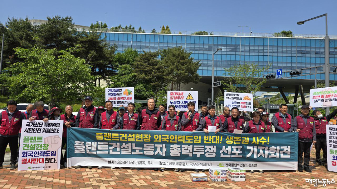 전국플랜트건설노조(위원장 이주안)는 9일 오전 정부세종청사 앞에서 기자회견을 열고 “인력난이 심각하다는 건설자본의 주장과 달리 플랜트건설현장에는 내국인력 공급이 충분하다”며 “이정식 고용노동부 장관이 플랜트건설현장에서 내국인력이 부족할 경우 외국인력을 허용하겠다고 밝힌 바, 정부는 소모적인 플랜트건설현장 외국인력 도입 논의를 중단해야 한다”고 강조했다. 이날 노조는 기자회견 뒤 플랜트건설 노동자 4만여명이 서명한 외국인력 도입 시도 중단 촉구 서명지를 대통령실 민정수석비서관실에 전달했다.
